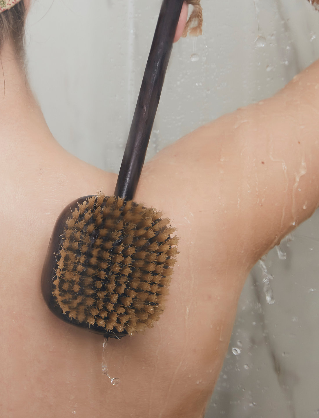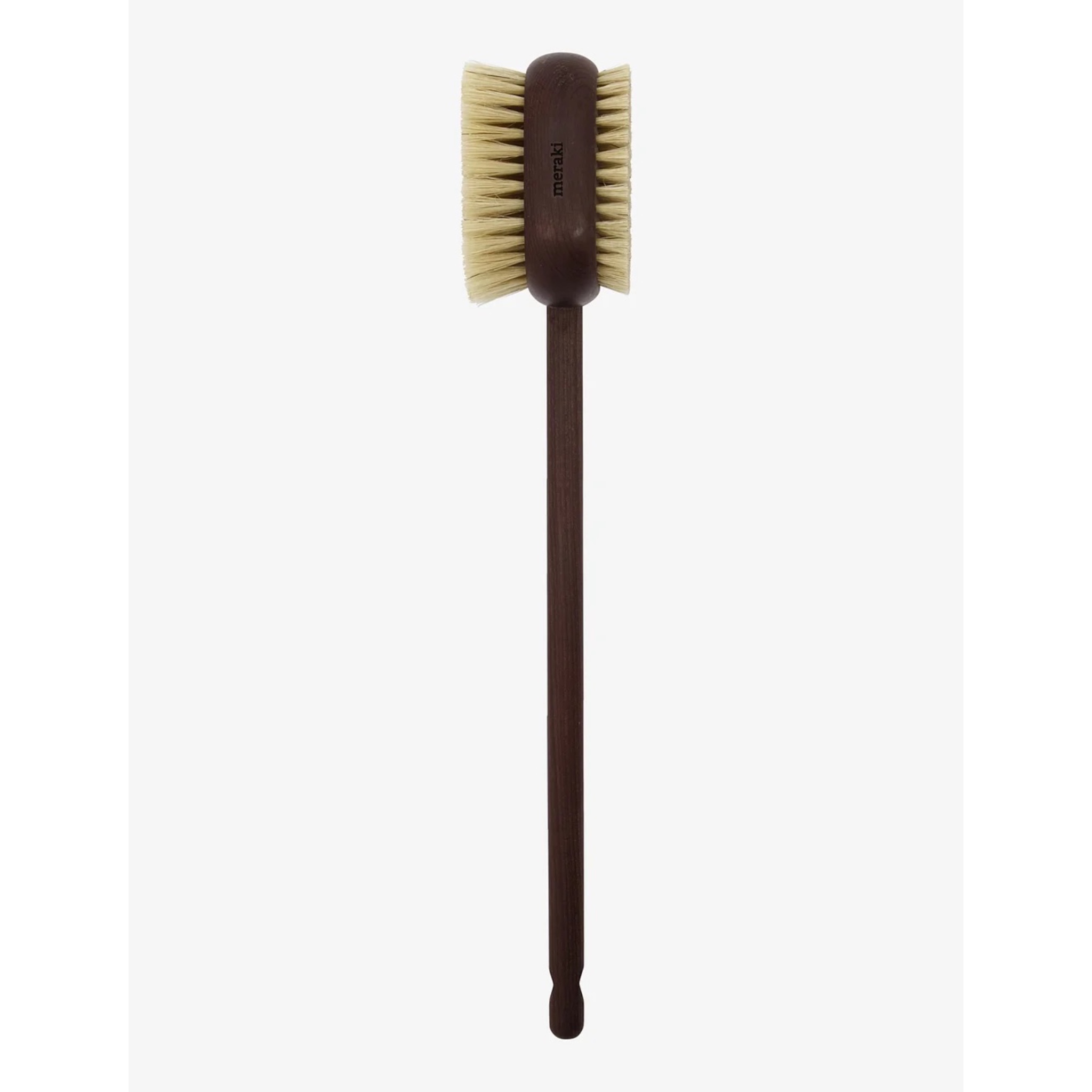 Med denne kropsbørste fra meraki kan du nemt og effektivt eksfoliere din hud. Gør det til en del af det daglige baderitual at bruge børsten under bruseren til at skrubbe, massere og rengøre huden. Ved regelmæssig brug fremmes blodcirkulationen, kredsløbet forbedres og cellefornyelsen sker hurtigere. Resultatet er en mere glat hud og et større velvære. Skaftet på kropsbørsten er så langt, så du kan nå hele ryggen. Når du har brugt den, skal du blot køre håndfladen hen over hårene, vaske med sæbe og hænge børsten til tørre. Den ene side af børsten har lange, bløde hår og den anden side har kortere, lidt stivere hår. takket være en varmebehandling er asketræet meget robust og kan modstå den fugt, der kan opstå i badeværelset.