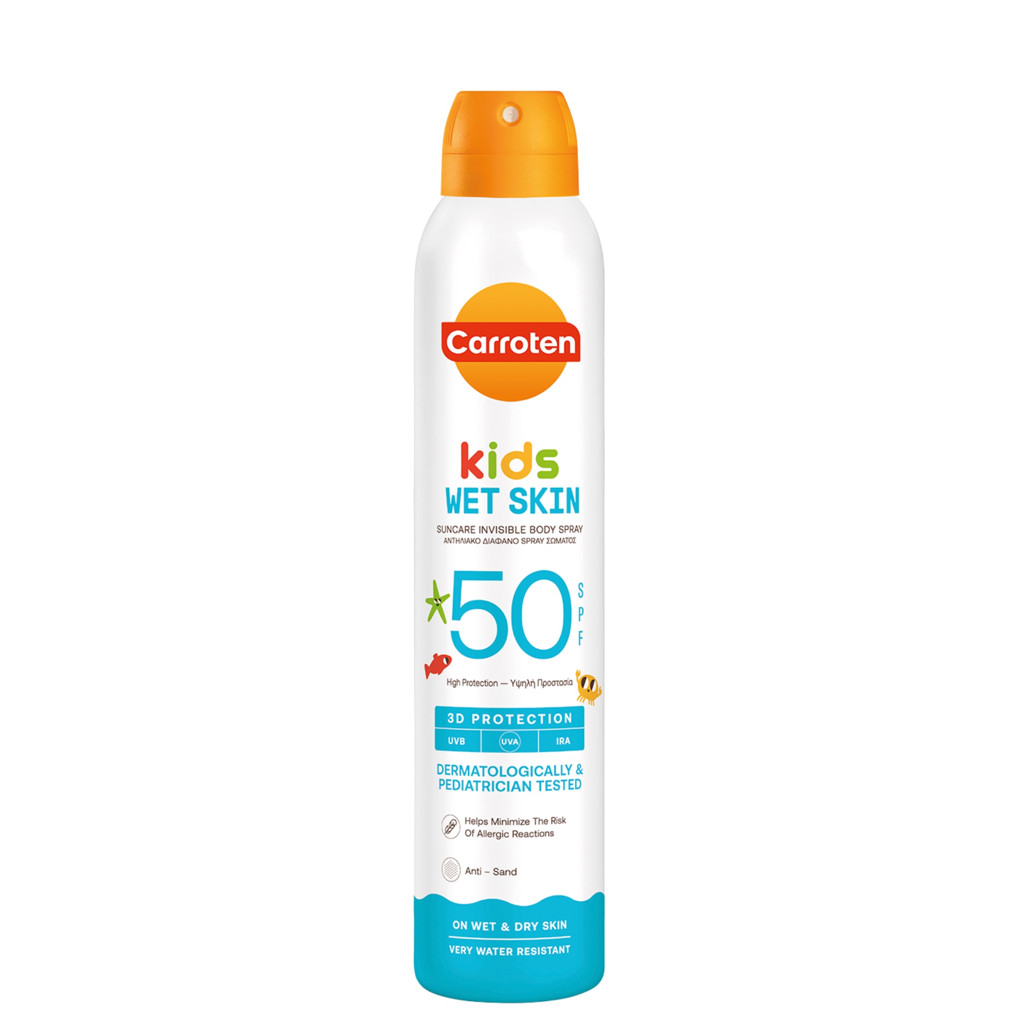 Carroten Kids Wet Skin gør solbeskyttelse af børn til en leg. Kan sprayes direkte på både våd og tør hud, vandfast, klistrer ikke og barnet er klar til solen!