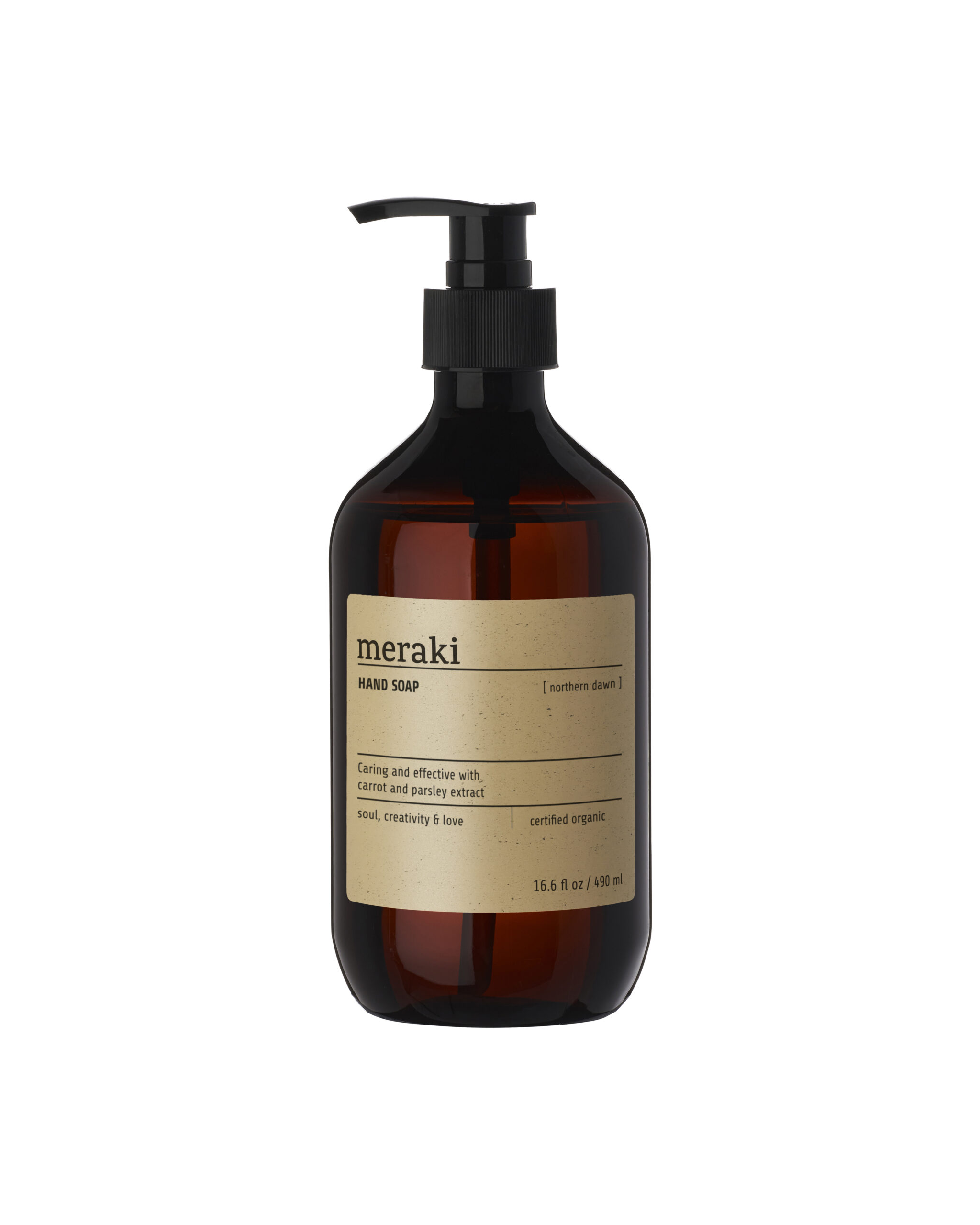 Meraki Hand Soap – Northern Dawn er en håndsæbe der mildt og effektivt rengør og plejer din hud samtidigt. Velegnet til alle hudtyper. Fri for farvestoffer og parabener. Certificeret økologisk håndsæbe fra Meraki. Northern Dawn ogindeholder et økologisk gulerodsekstrakt, som plejer og giver fugt. Derudover har ekstraktet fra persille ligeledes en plejende og rensende effekt. Din hud styrkes yderligere af et fugtbevarende aktiv fra sukkerroer. Certificeret COSMOS økologisk af Ecocert.