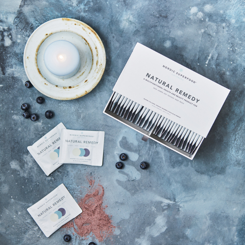 Natural Remedy Box fra Nordic Superfood indeholder 30 færdigpakkede breve med Marine Collagen, Seaweed & Blueberries lige til at tage med i tasken.