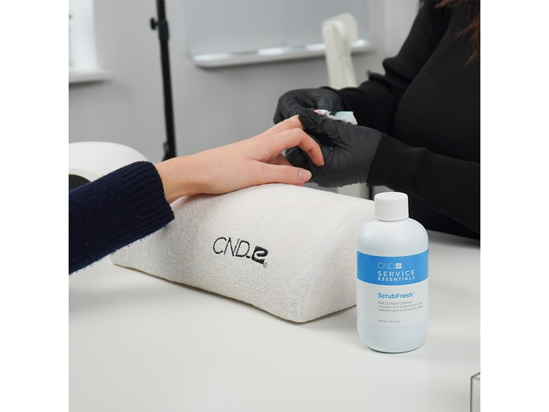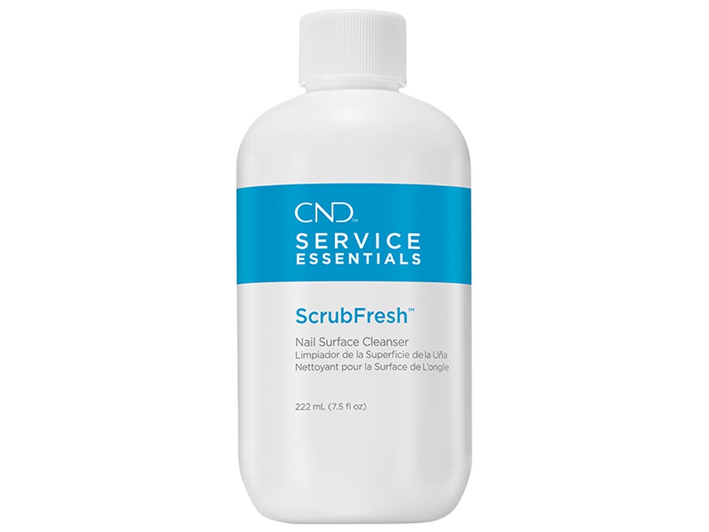 Anvendelse: Brug ScrubFresh™ med en fnugfri pad til midlertidigt at dehydrere neglepladen. Træk sidefolden på begge sider af neglen tilbage ved at bruge dine fingre i pincet-greb fra neden, og skrub neglene med pad’en. I neglebåndsområdet og i siderne kan der gemme sig olierester og filestøv, så det er vigtigt, at du renser ordentligt. Skrub neglen grundigt – som hvis du skulle fjerne rødt neglelak. Rens også under neglen. Hvis neglen på nogen måde bliver berørt under behandlingen, er det vigtigt, at du bruger ScrubFresh™ igen.